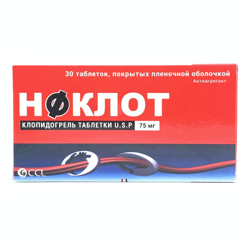 Профилактика атеротромбозу и его осложнений у взрослых: - у больных, перенесших инфаркт миокарда (начало лечения в срок от нескольких дней до 35 дней после возникновения), ишемический инсульт (начало лечения в срок от 7 дней до 6 месяцев после возникновения), или в которых диагностировано заболевание периферических артерий (поражение артерий и атеротромбозом сосудов нижних конечностей); - у больных с острым коронарным синдромом (ОКС) без подъема сегмента ST, в том числе у пациентов, которым был установлен стент в ходе проведения чрескожной коронарной ангиопластики, в комбинации с ацетилсалициловой кислотой; - у больных острым инфарктом миокарда с подъемом сегмента ST в комбинации с ацетилсалициловой кислотой (у больных, получающих стандартное медикаментозное лечение и которым показана тромболитическая терапия). Режим дозирования Взрослые и пациенты пожилого возраста: Ноклот® назначают по 75 мг 1 раз в сутки независимо от приема пищи. У больных с острым коронарным синдромом (ОКС) без подъема сегмента ST - лечение начинают с однократной нагрузочной дозы 300 мг, а затем продолжают лечение в дозе 75 мг 1 раз в сутки (в комбинации с ацетилсалициловой кислотой (АСК) в дозе 75-325 мг сутки. Рекомендовано не превышать дозу АСК 100 мг, поскольку применение высоких доз АСК повышает риск кровотечения). Препарат рекомендуется принимать каждый день примерно в одинаковое время. Оптимальная продолжительность лечения не установлена. Эффективно применение схемы лечения длительностью до 12 месяцев, максимальный эффект отмечается через 3 месяца после начала лечения. У больных острым инфарктом миокарда с подъемом сегмента ST назначают по 75 мг один раз в сутки, начиная с однократной нагрузочной дозы в комбинации с АСК, с тромболитиками или без них. Комбинированную терапию следует начинать как можно раньше после регистрации симптомов и продолжать по крайней мере четыре недели. Польза от комбинации клопидогреля с АСК более четырех недель при этом заболевании не изучалась. Лечение больных старше 75 лет начинают без нагрузочной дозы клопидогреля. Терапевтический опыт применения препарата у пациентов с почечной недостаточностью и у пациентов с заболеваниями печени средней тяжести и возможностью возникновения геморрагического диатеза ограничен